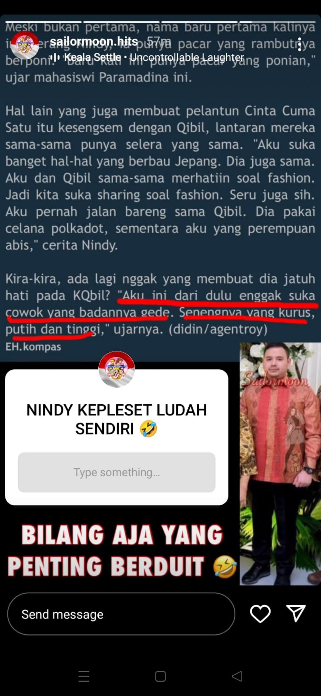 "Aku ini dari dulu enggak suka cowok yang badannya gede. Senengnya yag kurus, putig dan tinggi," bunyi kalimat pengakuan Nindy saat itu.