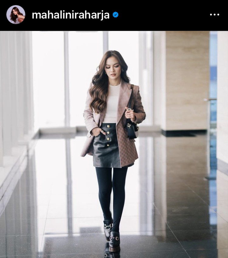 Pada foto pertamanya, perempuan asal Bali ini tampil berkelas memakai inner putih dipadukan dengan blazer motif khas Gucci, rok mini, dan stocking. Dia menambahkan shoulder bag hitam dan loafer warna senada.