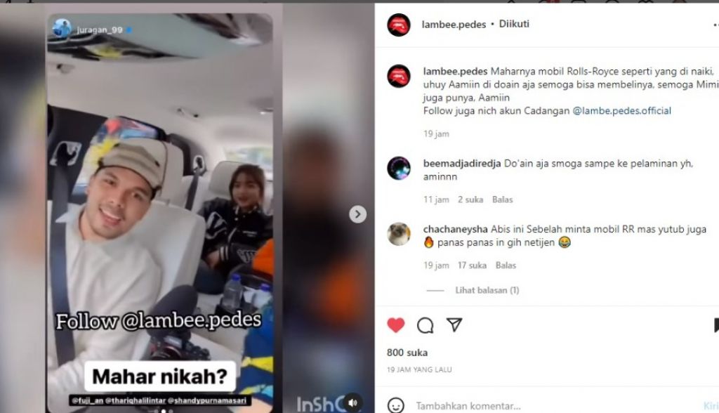 Cuplikan video Instagram Stories yang kembali diunggah akun @lambee.pedes itu pun sontak dibanjiri beragam komentar dari warganet. Banyak di antara mereka yang justru mengamini perkataan Fuji dan mendukung bila keduanya menikah.