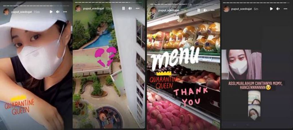 Tak hanya itu, Puput juga memperlihatkan aktivitasnya saat menjalani karantina dan menunjukkan menu makanan juga buah-buahan yang dikonsumsinya. Ia juga memamerkan matanya yang sembab diduga lantaran tak sanggup menahan rindu ketika sedang video call dengan putri bungsunya. "Assalamu\'alaikum cantiknya Momy, kangen," seru Puput.