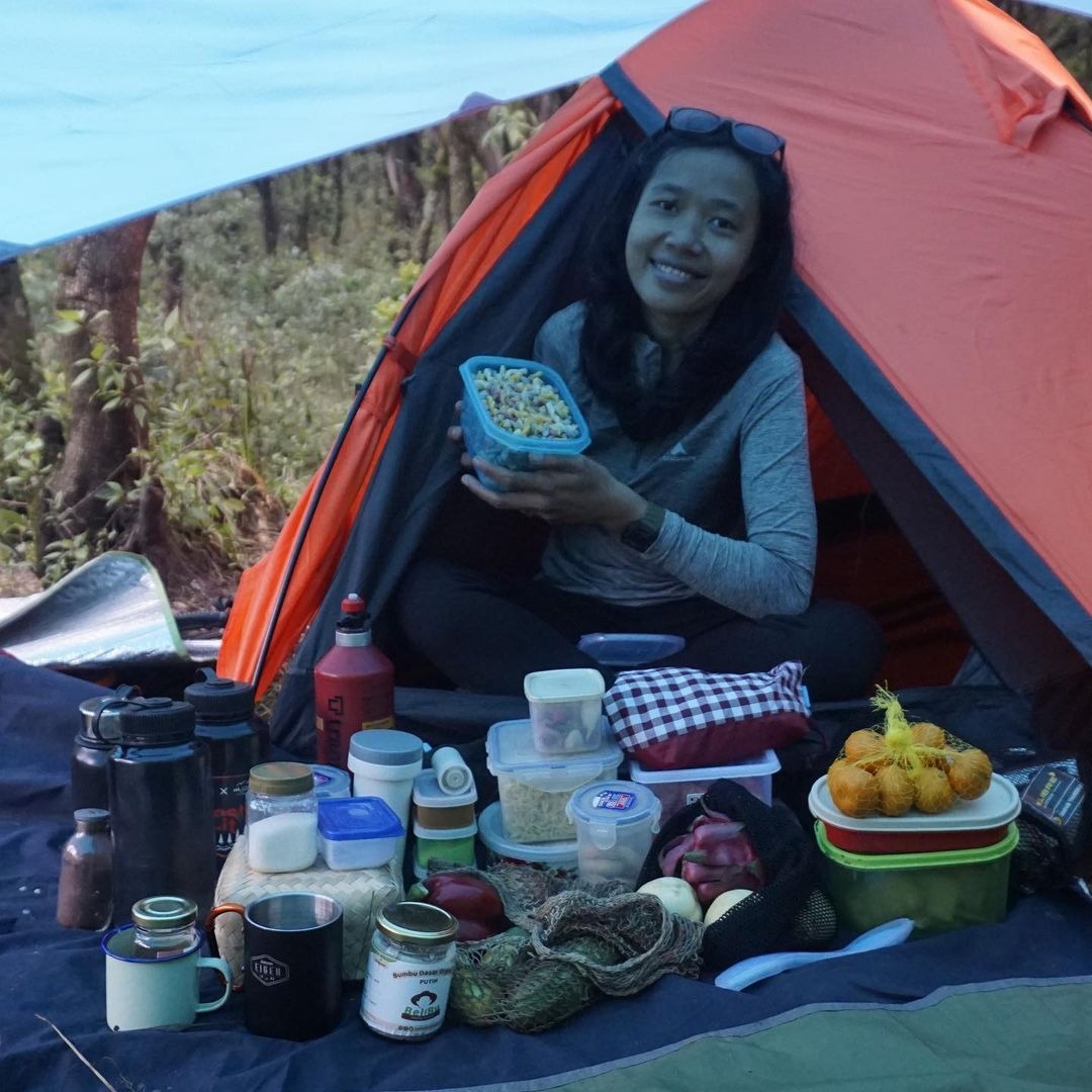 Menurut data Taman Nasional Gunung Gede Pangrango, sampah terbanyak yang ditemukan di gunung itu sampah botol plastik sekali pakai. Karena itu, kita bisa menghindarinya dengan membagi kebutuhan air mineral ke dalam botol-botol minum, jelas Siska. Selain itu, bawa perbekalan menggunakan tempat makan yang juga bisa dipakai berkali-kali. Untuk cemilan, bawa aja buah potong di dalam tempat makan. Selain menghindari sampah, buah juga lebih sehat karena mengandung banyak air dan energi.