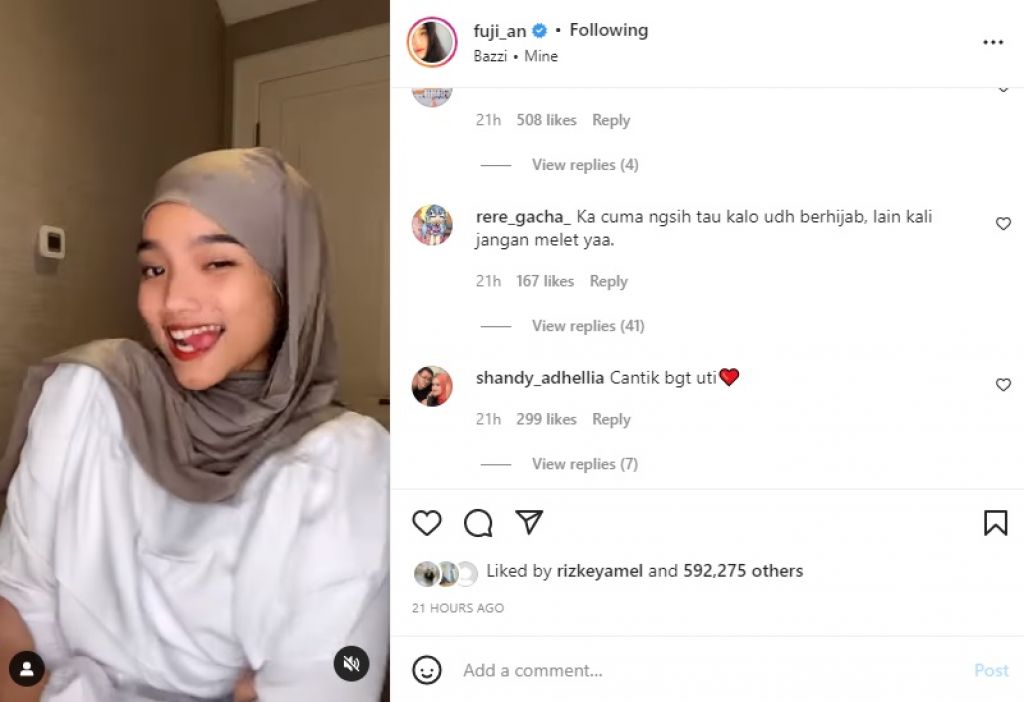 Netizen langsung melempar komentar dalam video tersebut. Banyak yang memuji Fuji yang tapil cantik berhijab.