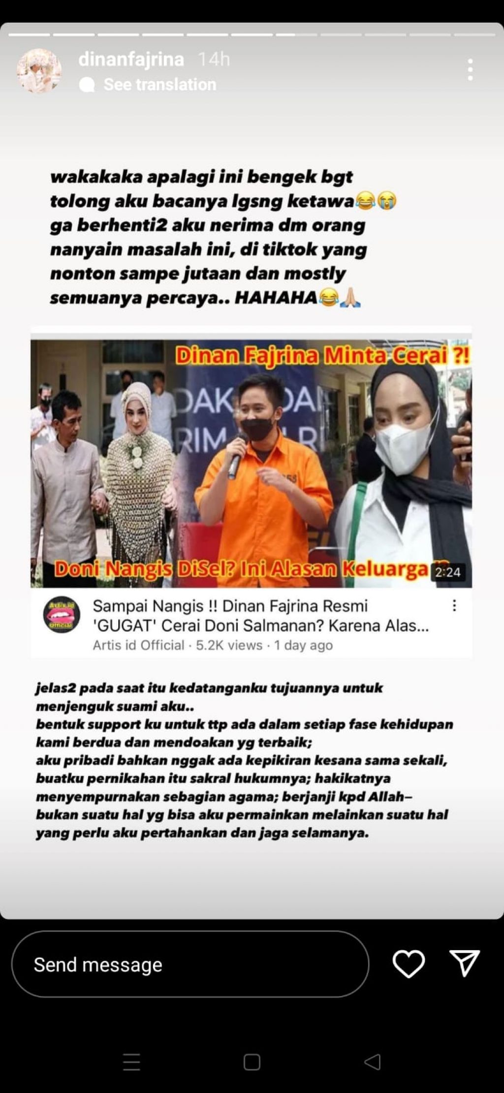 Dinan tampak mengunggah capture salah satu pemberitaan di YouTube dengan judul headline , "Sampai Nangis!! Dinan Fajrina Resmi \'GUGAT\' Cerai Doni Salmanan? Karena Alasan..."