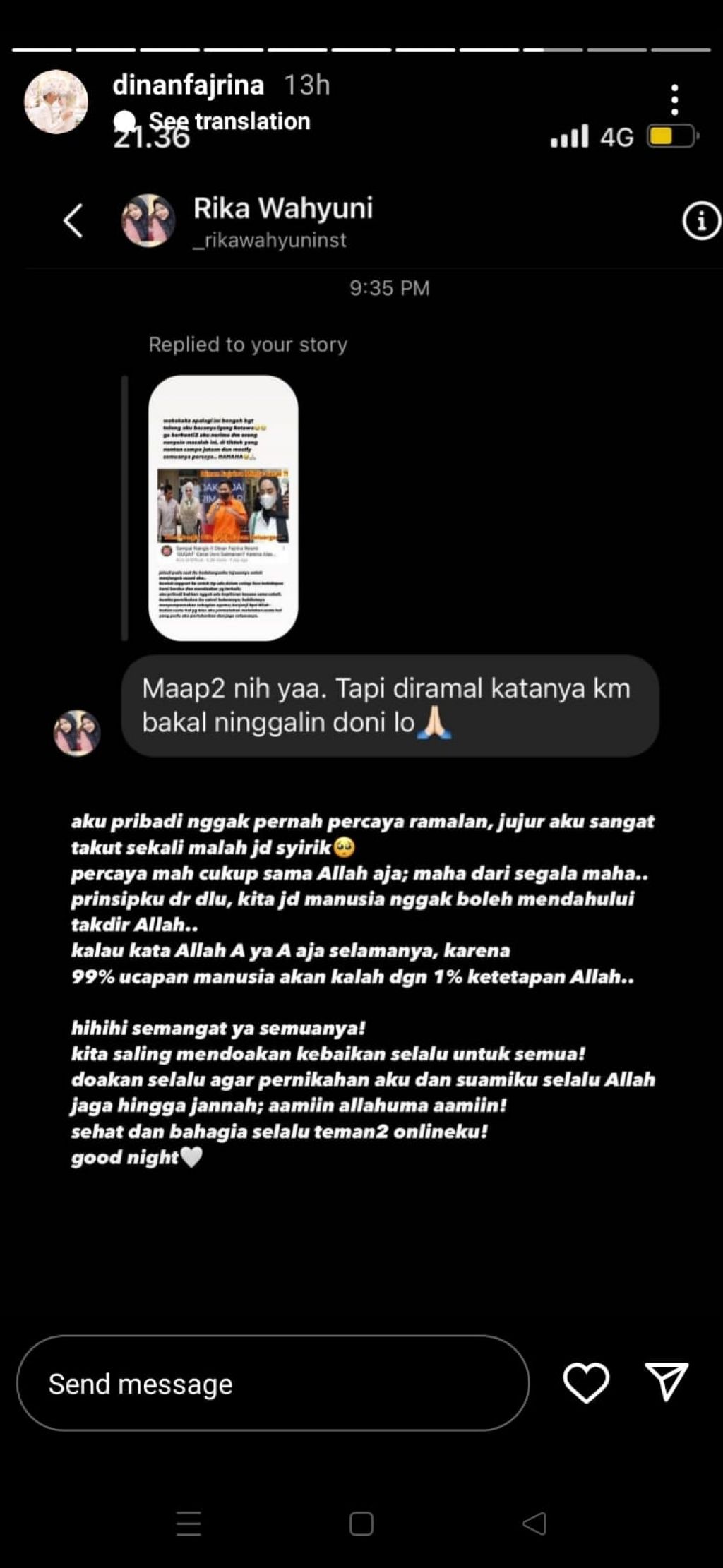 Dalam unggahan selanjutya, Dinan juga semat menyinggung soal ramalan terkait rumah tangganya dengan Doni Salmanan yang akan berakhir dengan perceraian.