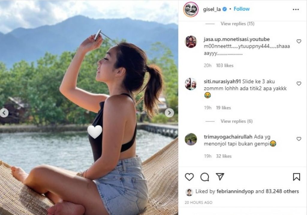Gisel tampak mengunggah potretnya yang terngah bersantai di kursi rotan dengan pemandangan gunung dan laut. Ia tampil cantik dengan menggunakan tank top berwarna hitam yang dipadukan dengan hot pants jeans.