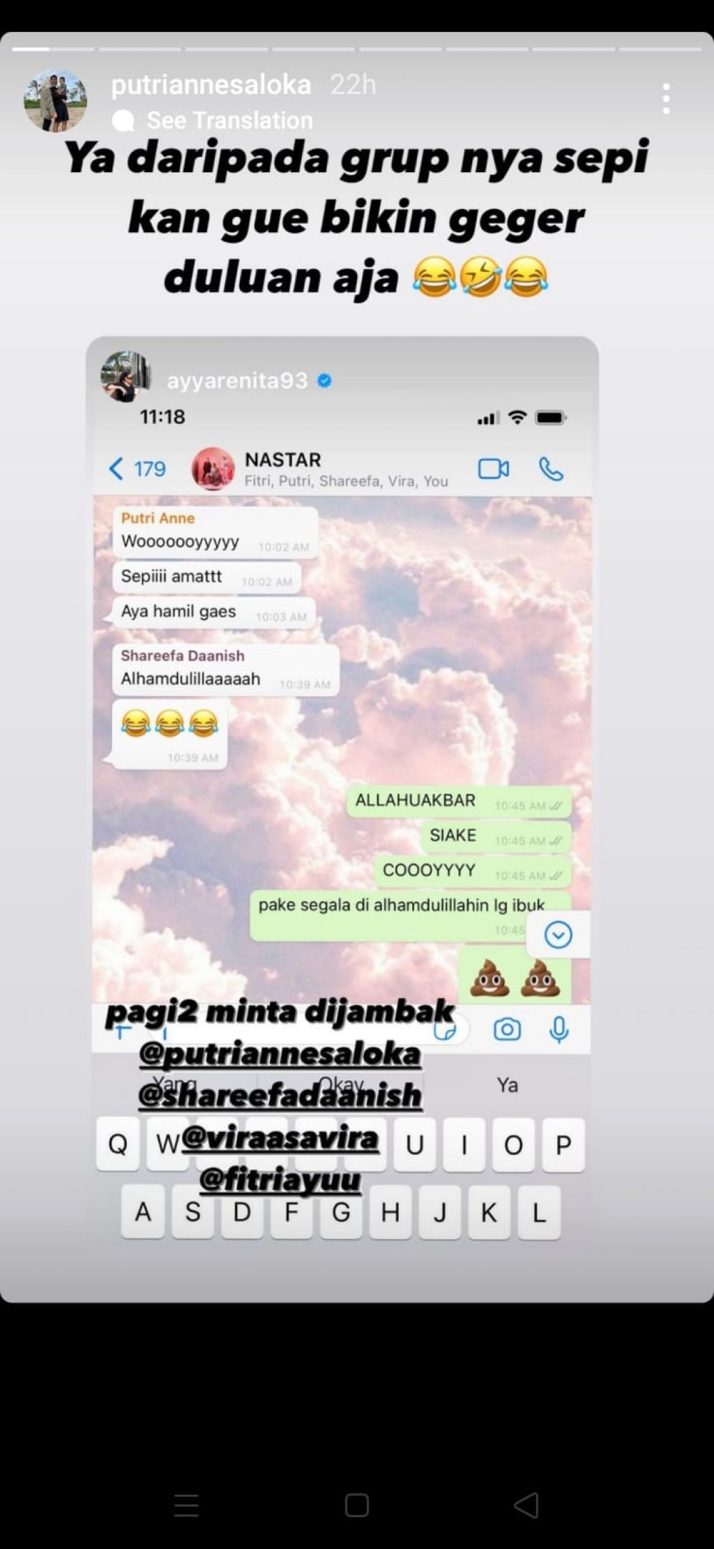 Putri Anne pun tampak mencoba meramaikan group dengan menebar gosip. Di situ terlihat, Putri Anne sontak mengatakan kalau Ayya Renita tengah hamil.