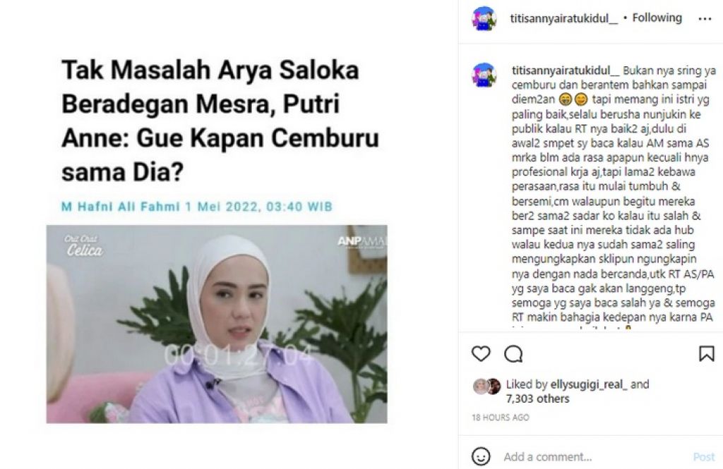Dikatakan akun tersebut, Putri Anne (PA) selalu berusaha menunjukkan kepada publik bahwa rumah tangganya dengan suaminya baik-baik saja. Padahal, benih-benih cinta antara Arya Saloka (AS) dan Amanda Manopo (AM) telah muncul.