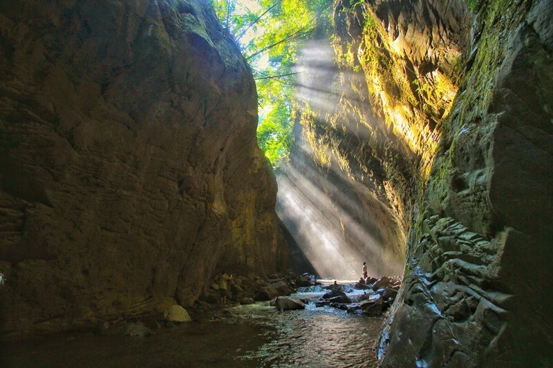 Dari foto di atas saja sudah terlihat indahnya, bukan? Daya tarik dari Curug Ibun Pelangi terdapat pada sungai surut dan air terjun super pendek yang berada di dalam sebuah batu besar menyerupai gua. Menariknya lagi, cahaya matahari yang masuk di sela-sela pepohonan di atasnya terlihat sangat indah, bak cahaya surga. Berlokasi di daerah Argapura, Majalengka, tiket masuk untuk Curug Ibun Pelangi hanya Rp15 ribu.