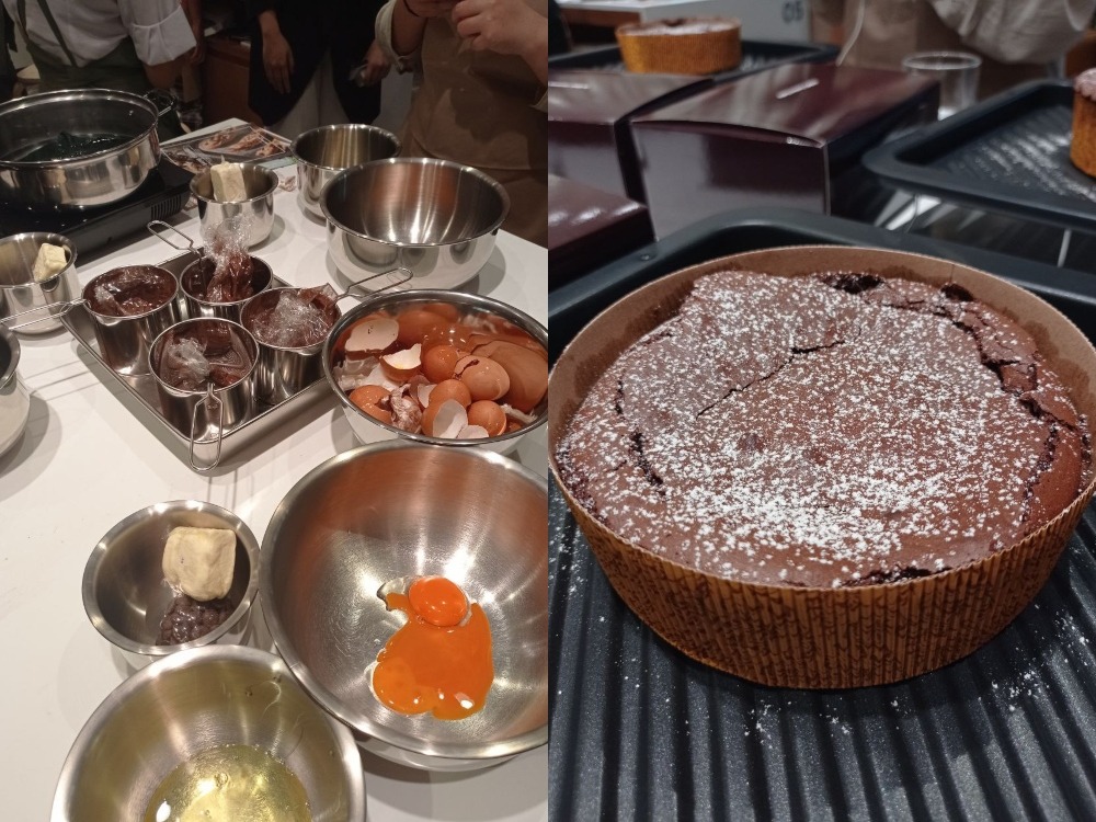 Pada saat kelas dimulai, saya mendapat kesempatan untuk mencoba membuat hidangan Gateau au Chocolate . Terdapat pendamping di masing-masing meja yang akan mendampingi peserta selama kelas berlangsung. Saya ditemani oleh Shevira, yang akan memberi arahan untuk membuat Gateau au Chocolate dari awal sampai akhir bersama dengan tiga teman kelompok saya. Kami dijelaskan mulai dari bahan yang digunakan secara spesifik, cara menggunakan alat-alatnya, beberapa teknik dalam pembuatan, dan lain sebagainya. Dari segi pengajar yang ramah dan memiliki wawasan luas, saya sangat mengapresiasinya.
