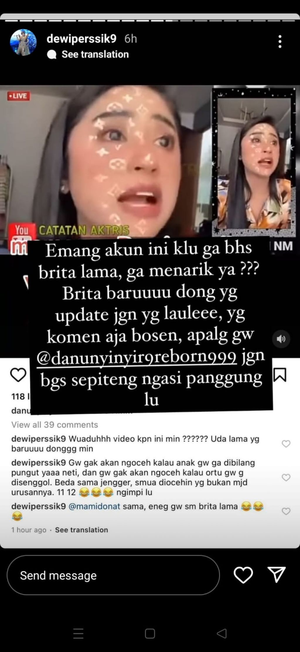 "@danunyinyir9reborn999 lu akun gosip cr info yang baru donggggg, jgn yg basi yg lu posting receh amat sih ????????????????," timpal Dewi lagi.