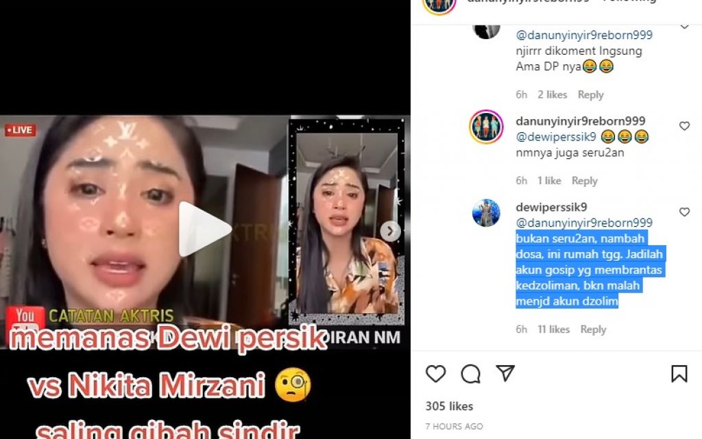 "@danunyinyir9reborn999 bukan seru2an, nambah dosa, ini rumah tgg. Jadilah akun gosip yg membrantas kedzoliman, bkn malah menjd akun dzolim," timpal Dewi Perssik.