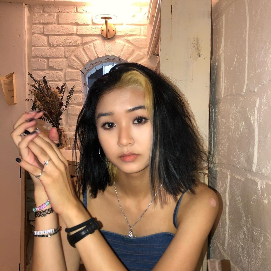 Sepertinya, perempuan kelahiran 2001 ini gemar bermain dengan warna-warna yang cukup berani. Tak lama setelah blonde peek a boo hairstyle, ia kemudian menghitamkan seluruh rambutnya seperti semula. Meski rambutnya kembali seperti biasa, riasan yang digunakan tentu tak biasa.