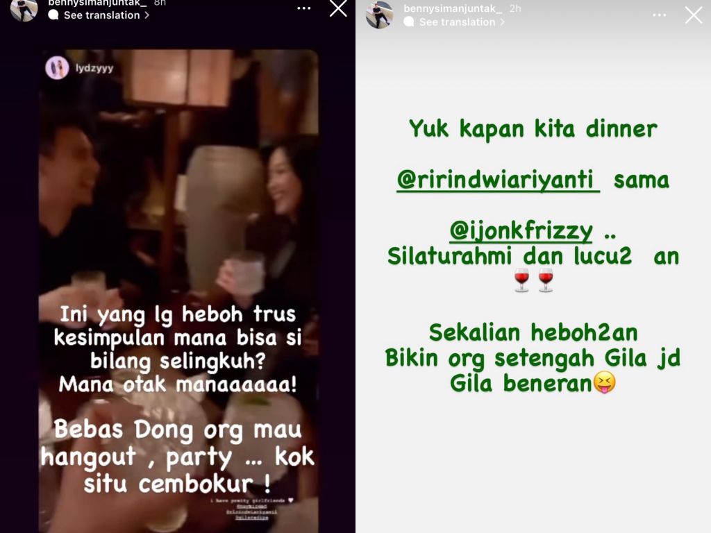 "Yuk kapan kita dinner @ririndwiariyanti sama @ijonkfrizzy, silaturahmi dan lucu-lucuan. Sekalian heboh-hebohan bikin orang setengah gila jadi gila beneran," pungkas Benny Simanjuntak, paman Jonathan Frizzy.