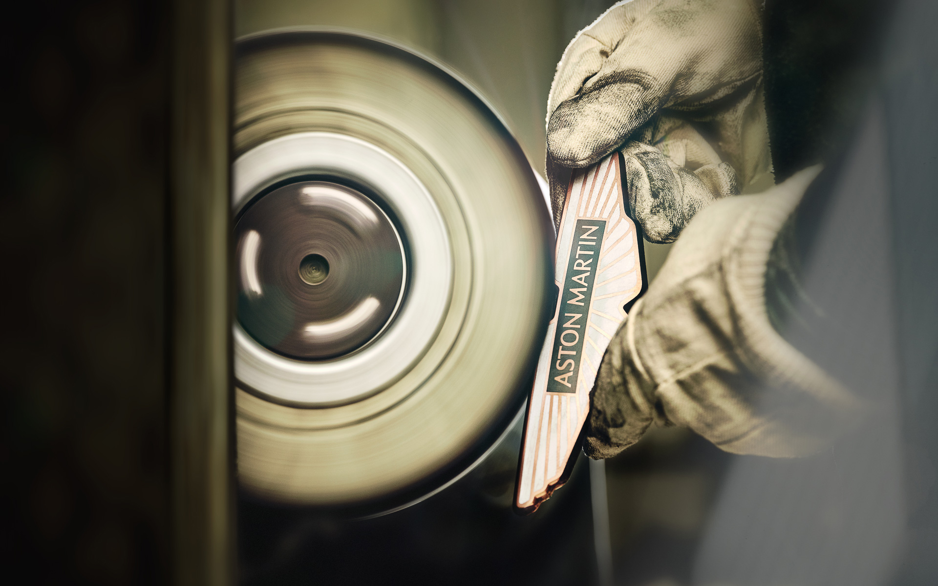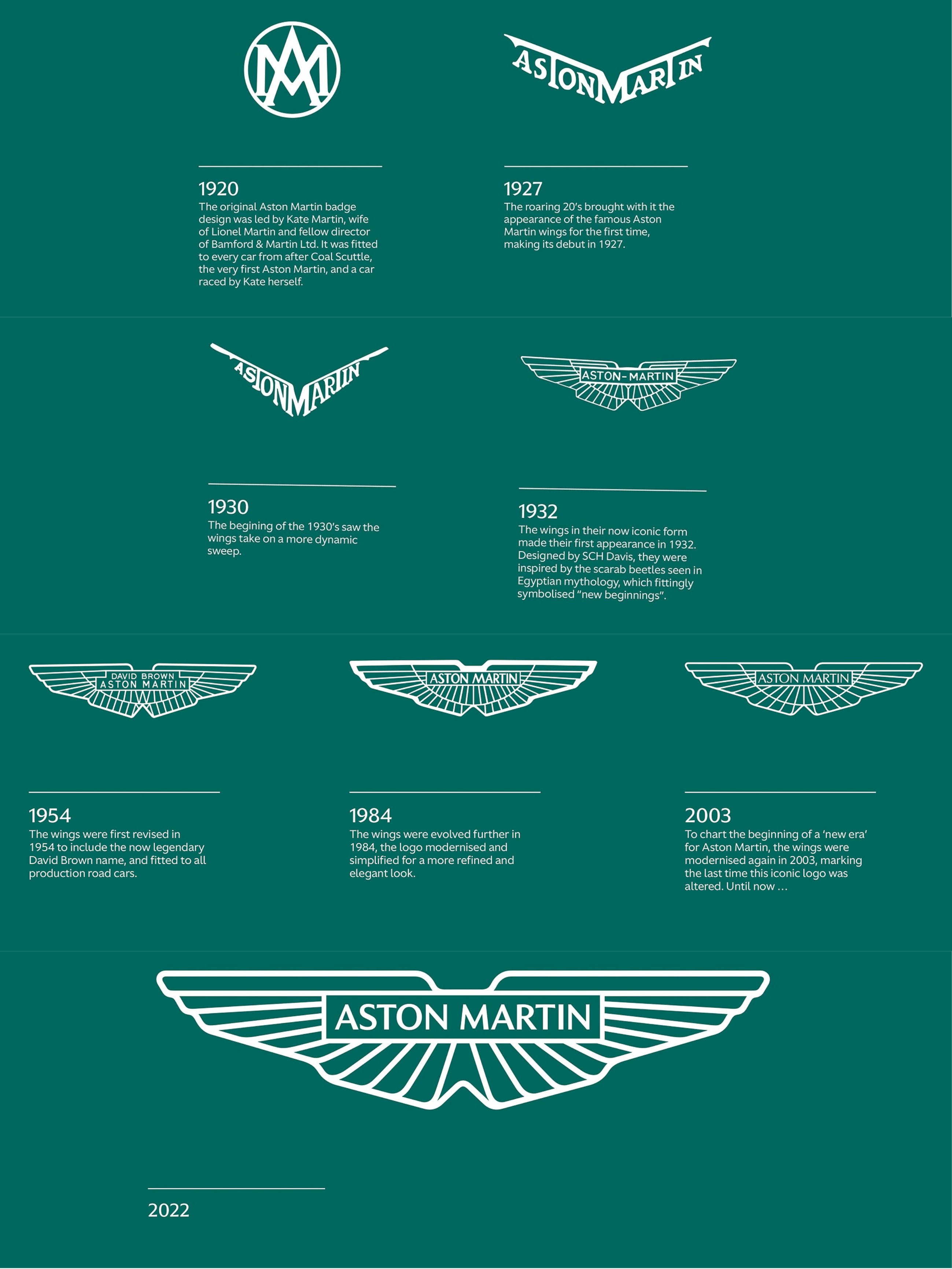 Desain logo sayap ikonik merek tersebut diproduksi bersama oleh departemen desain Aston Martin, dan desainer grafis Inggris, Peter Saville.