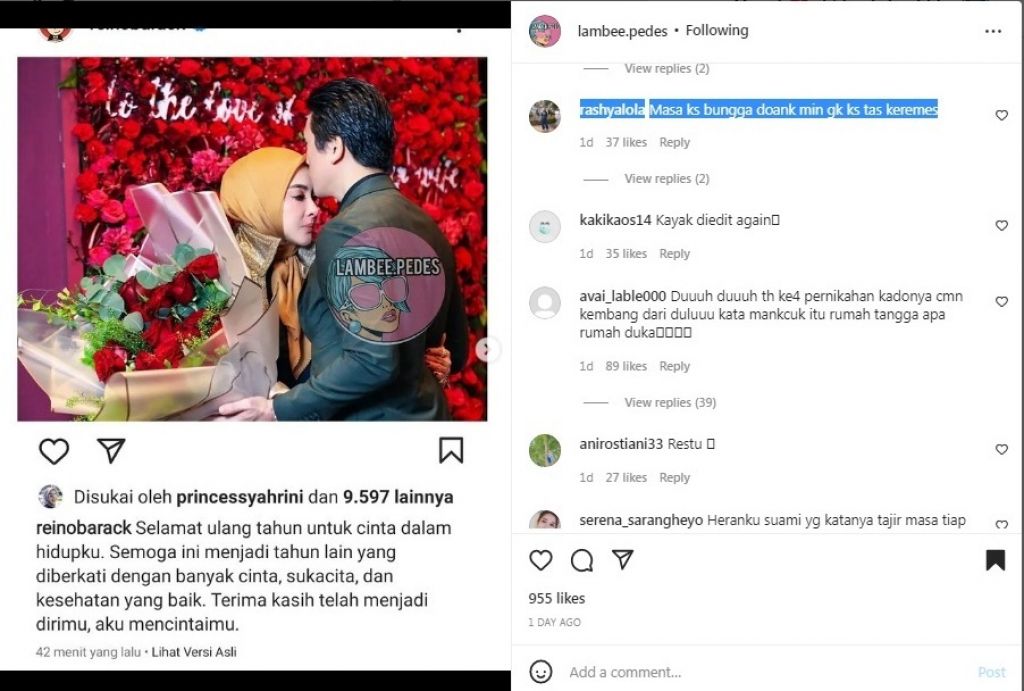 Unggahan tersebut pun menjadi sorotan dan diunggah di berbagai akun gosip salah satunya @lambee.pedes, dalam postingan itu netizen dibuat salah fokus karena tak ada kado mewah yang terlihat diberikan Reino Barack pada istrinya yang sedang berulang tahun itu hanya sebuah buket bunga saja.