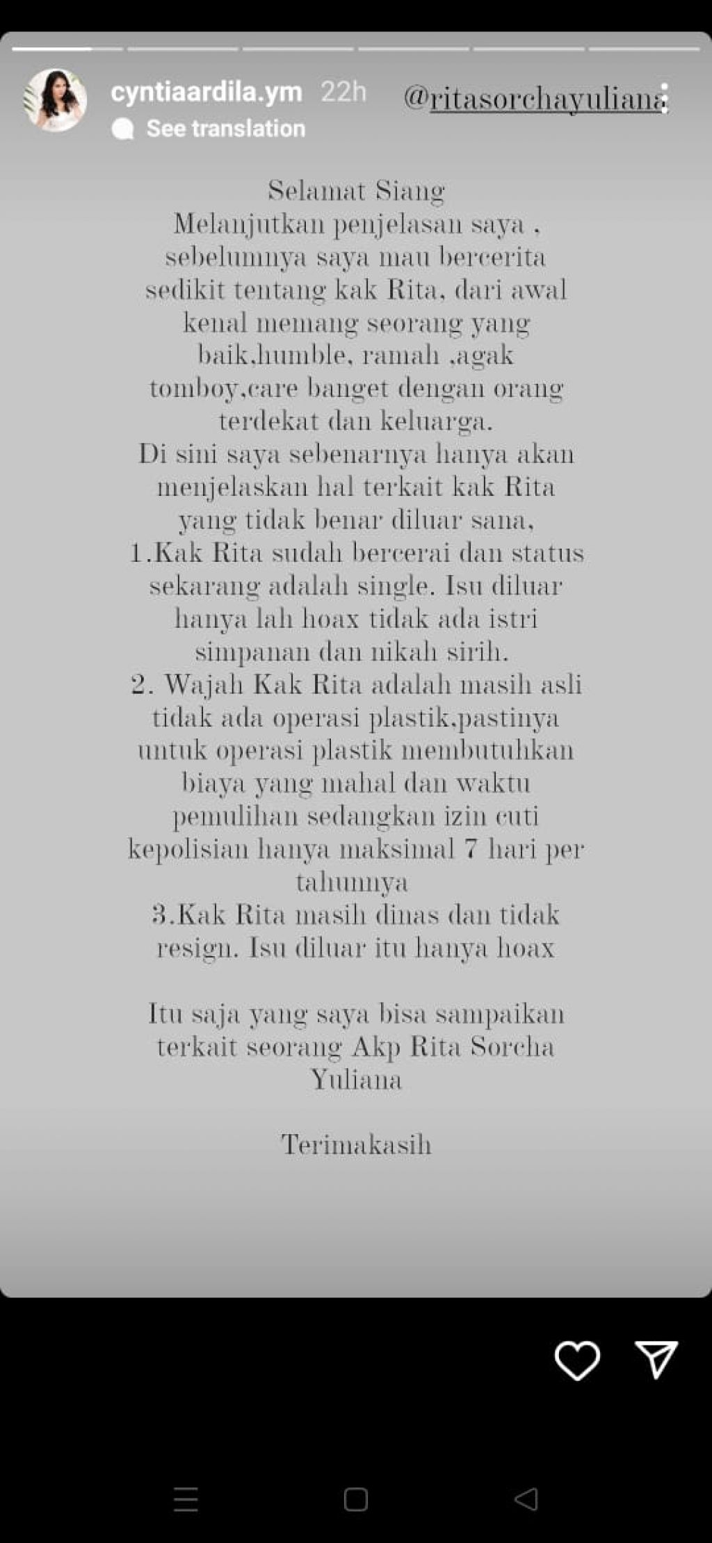 Kini kebenaran akhirnya diungkap langsung oleh sahabat AKP Rita Yuliana, Cynthia Ardila. Hal tersebut diungkap Cynthia dalam unggahan Instagram Stories miliknya, Minggu (14/8/2022).