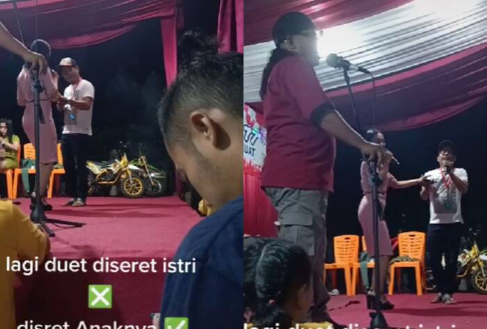 Beredar video yang memperlihatkan seorang bocah perempuan mengamuk di atas panggung hajatan. Dia marah dan menjemput paksa seorang pria yang sedang berduet dengan biduan .
