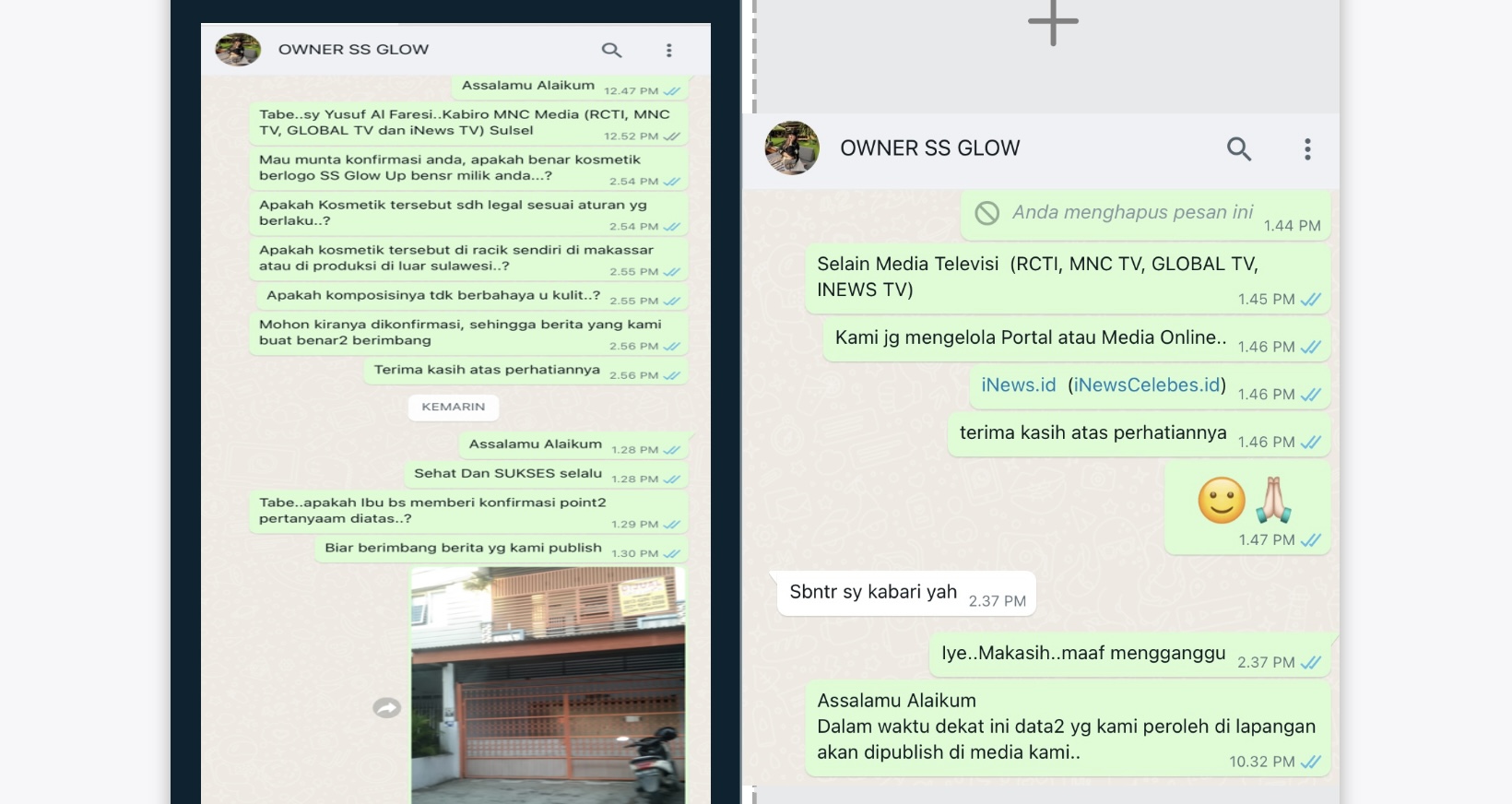 Menindak lanjuti temuan kami dan keterangan narasumber, tim redaksi iNewsCelebes.id berusaha meminta konfirmasi dari owner atau pemilik kosmetik SS Glowup, Sarah Sartika. Baik via WhastUp maupun via telepon. Namun tidak ada penjelasan detail atau bantahan terkait informasi awal yang kami peroleh. Hanya balasan pesan singkat Nanti saya kabari yah.