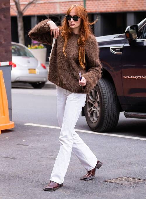 4. Cocok untuk ke kampus, kamu bisa memadukan atasan berwarna senada dengan sepatu loafers dan denim putih ala Sophie Turner