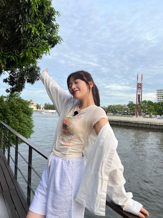 Jalan-jalan sore bareng Bestie ? Coba tiru penampilan santai ala Yujin dengan basic T-shirt yang dipadukan dengan short training pants , lalu kamu bisa memakai kemeja favorit sebagai outer