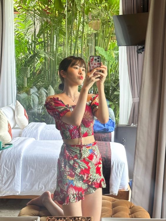 Selain one piece dress , opsi lainnya kamu pun bisa mengenakan two piece mini dress dengan warna merah dan bermotif dedaunan yang akan bikin penampilanmu jadi lebih manis