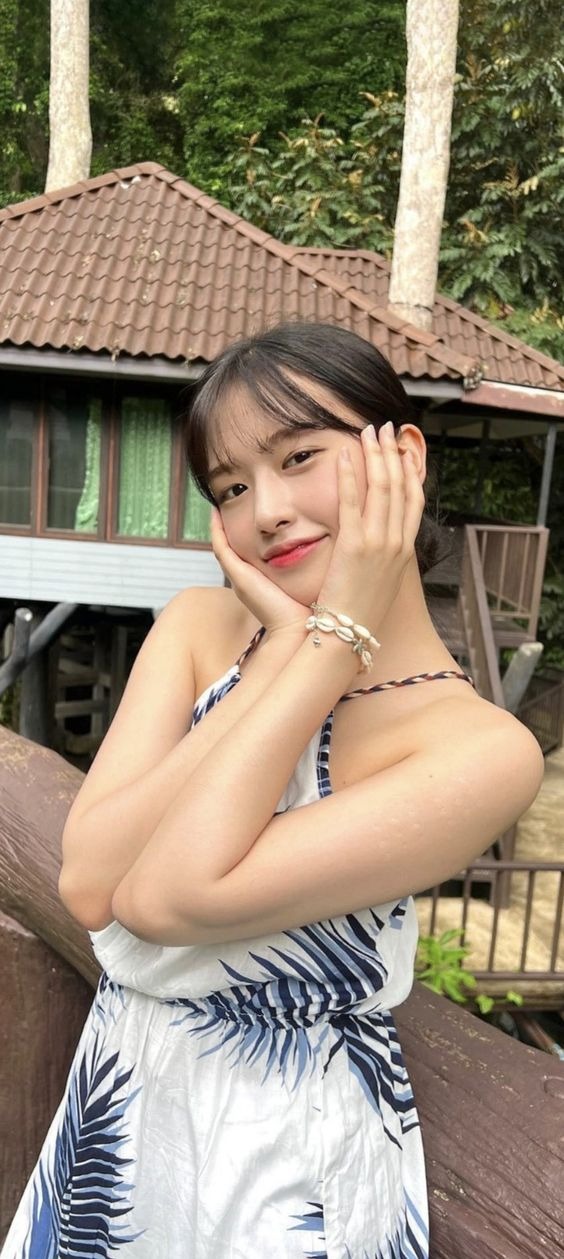 Liburan atau staycation di dekat pantai, cocok banget kalau memakai outfit tropical dress tanpa lengan ala Ahn Yu-jin seperti penampilannya satu ini