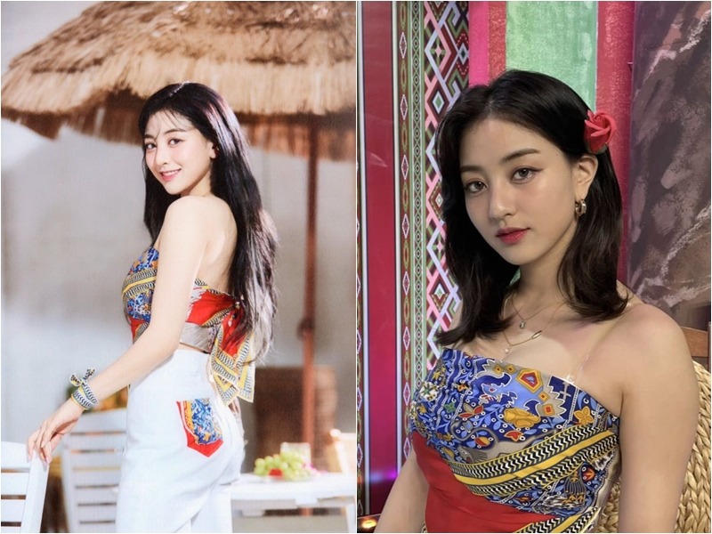Jihyo TWICE - Saat tampil di video musik TWICE yang bertajuk Alcohol Free , Jihyo tampil menawan dengan balutan kain batik colorful yang disulap menjadi tube top