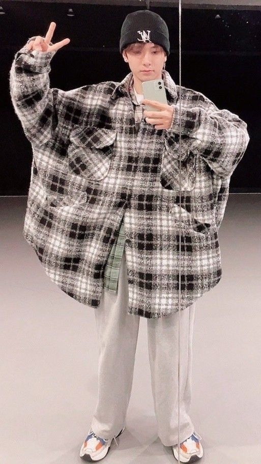 Tampak mungil, Hee-seung mengenakan oversized flannel t-shirt sebagai outer , dipadukan dengan training pants dan sepatu olahraga saat sedang latihan koreo