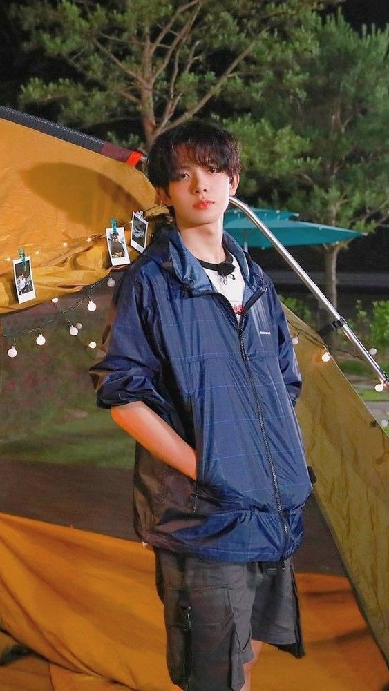 Memakai jaket gunung berbahan parasut biru dan celana cargo pendek, outfit ala Hee-seung ini cocok banget untuk jadi inspirasi saat camping bareng teman-teman!