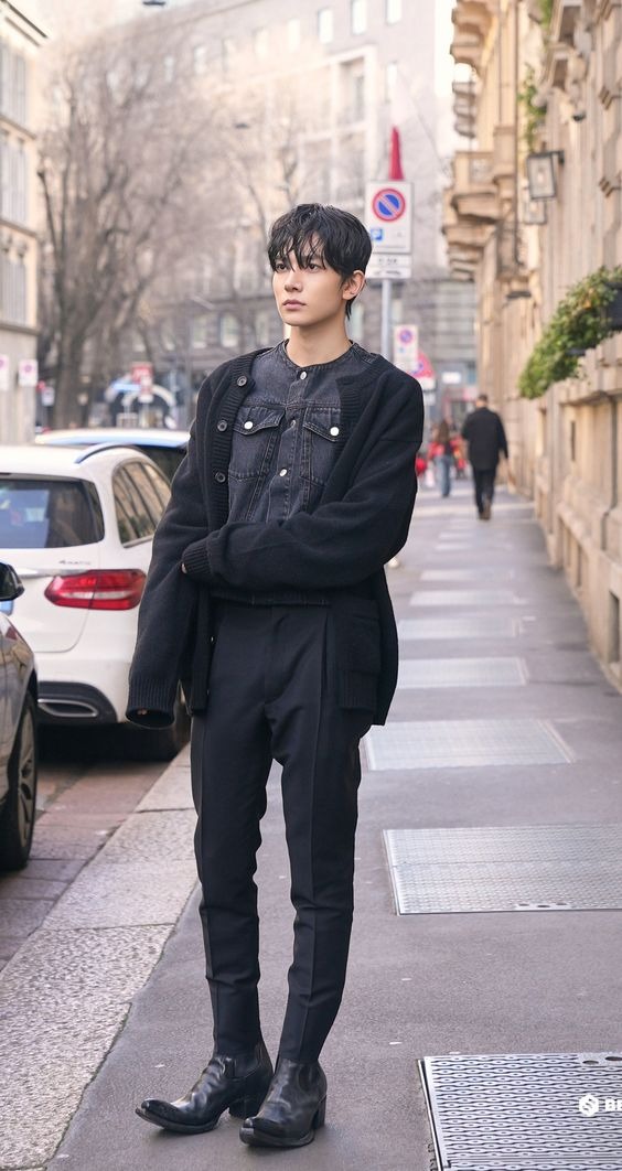 Tampil manly , Hee-seung kenakan outfit tema monokrom serba hitam, mengombinasikan knit cardigan , kemeja denim, khaki pants serta sepatu boots