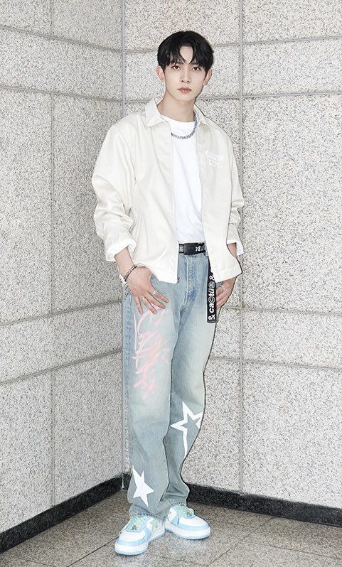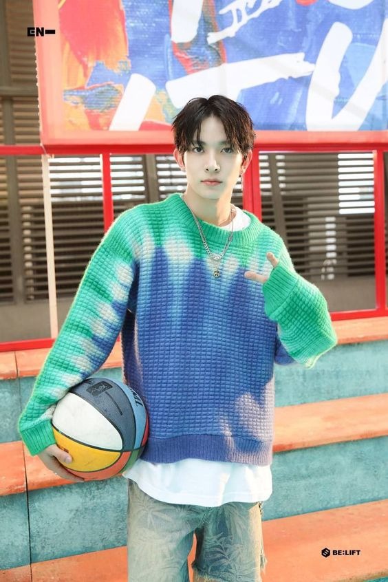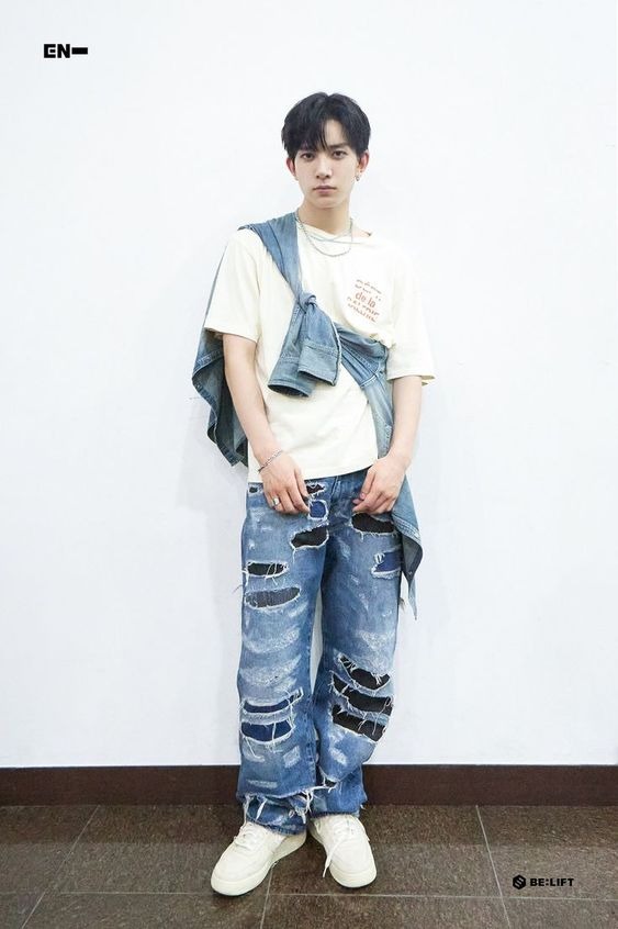 Tampil edgy , member tertua dari ENHYPEN ini tampak keren dengan kaos putih, mengikat jaket denimnya, serta menambahkan ripped jeans dan sepatu putih