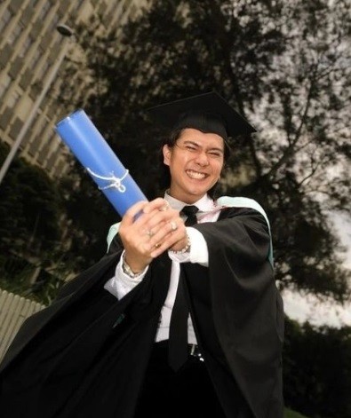 Salah satunya bisa terlihat dalam potret berikut. Di foto dia memancarkan rona bahagia setelah dinyatakan lulus kuliah. Dia terlihat berpose memakai toga sambil memamerkan tabung ijazah berwarna biru.