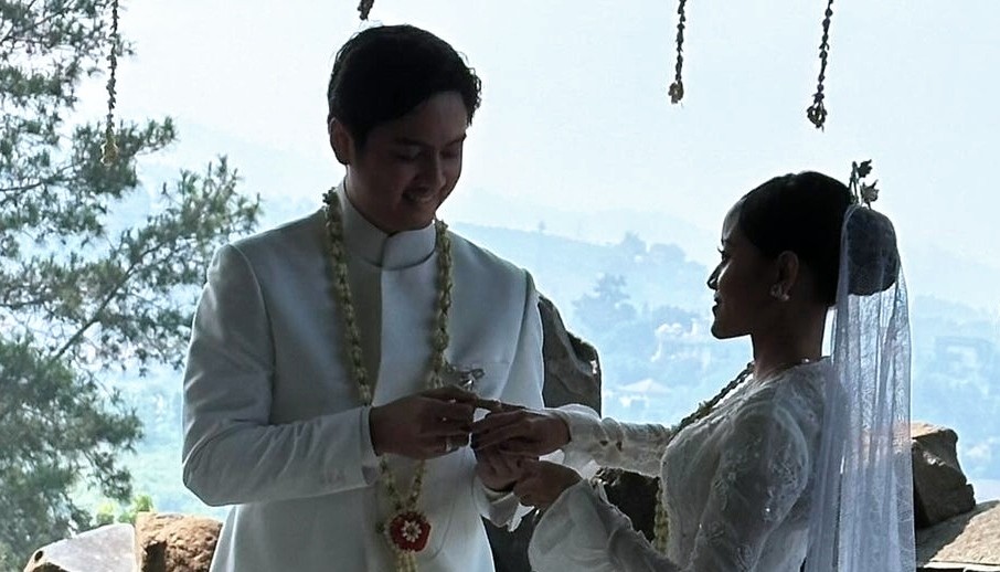 Sosok Sasqia pun tampil anggun dalam balutan kebaya putih ala adat Sunda dengan ornamen bunga melati. Terdapat pula potret saat Zaki memasangkan cincin pernikahan di jari manis Sasqia. Wajah kegembiraan begitu terpancar di momentum sakral ini.