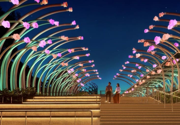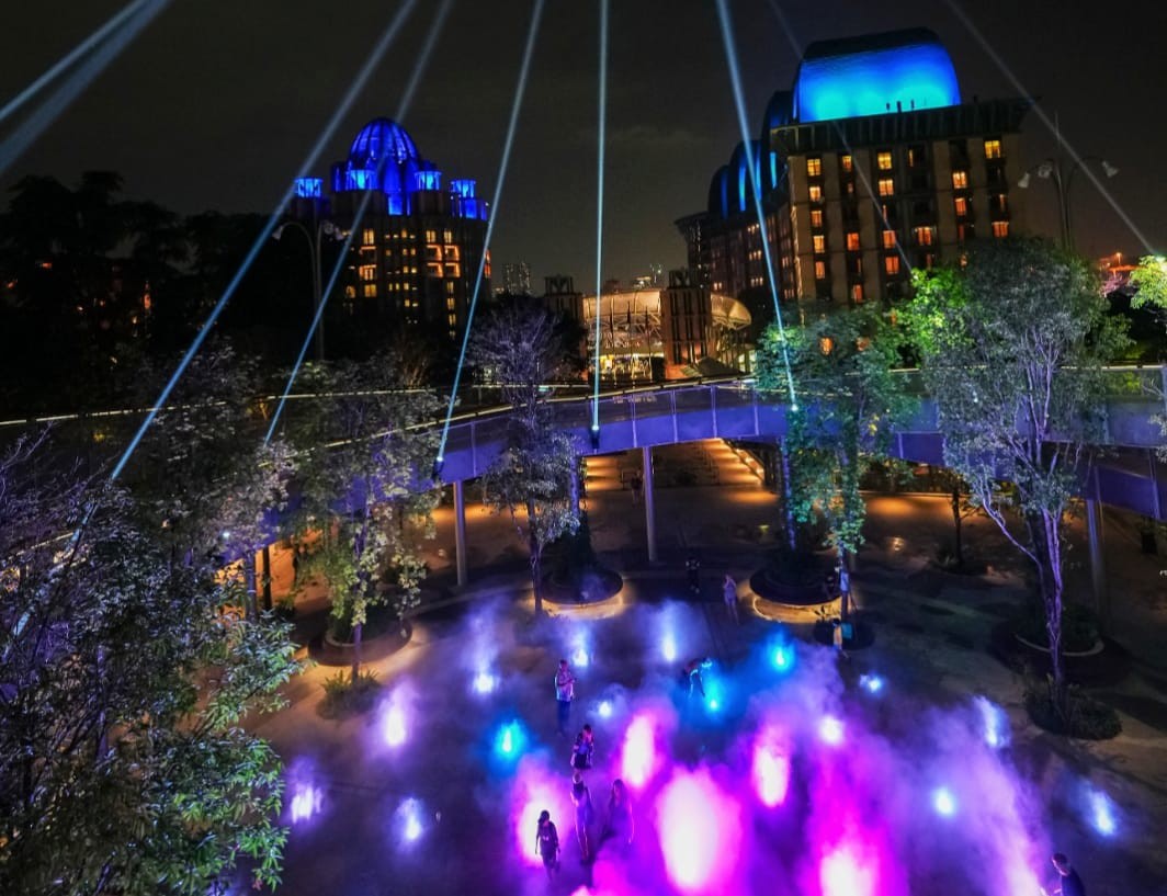 Ini titik awal perjalanan menakjubkan di Sentosa Sensoryscape. Saksikan pemandangan memukau malam hari di Taman Cahaya ditemani jajaran instalasi lampu berbentuk tangkai bunga menjulang tinggi di kiri dan kanan jalan yang menerangi alun-alun dengan warna-warna yang berubah secara ritmis.