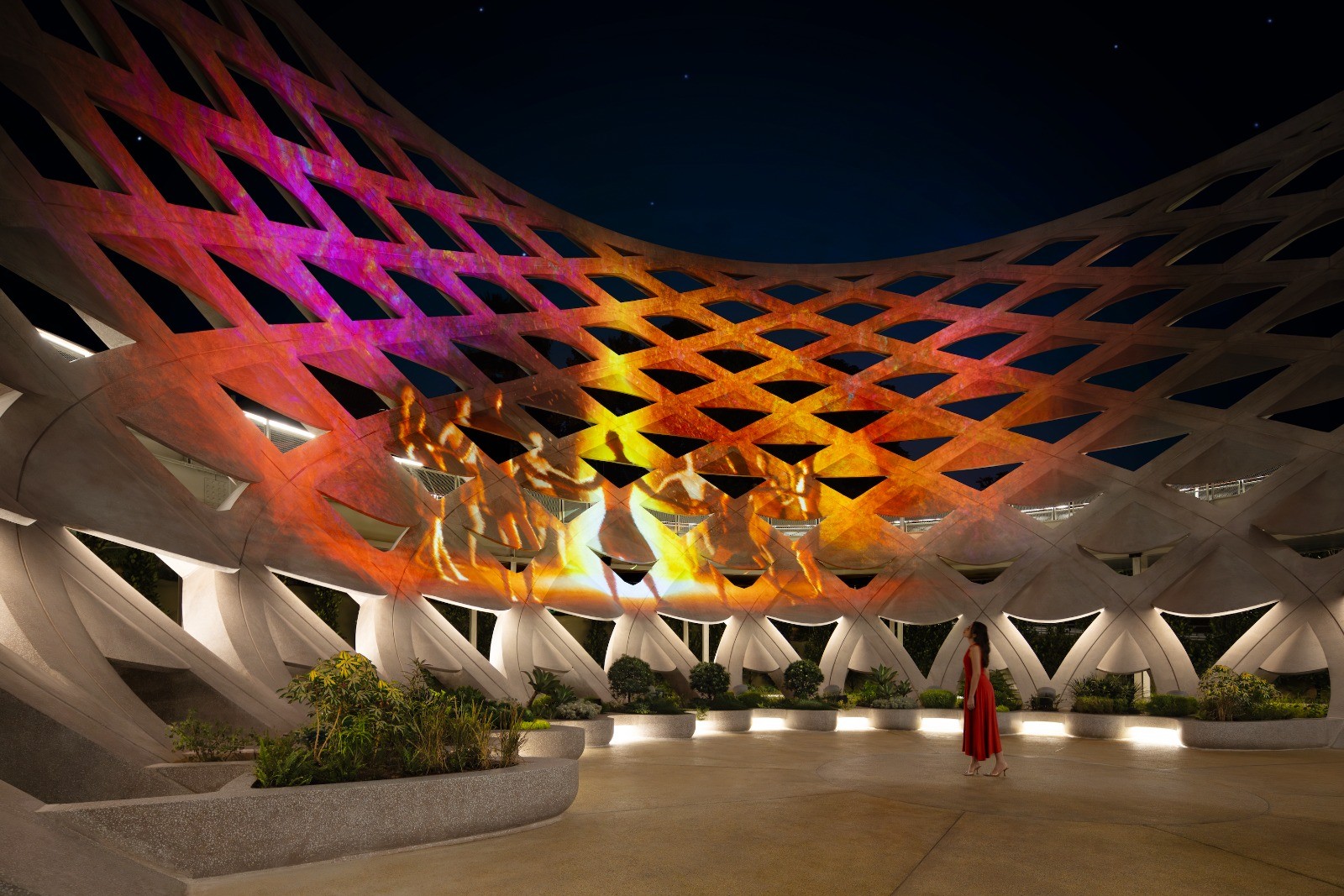 Instalasi bangunannya berbentuk kelopak bejana granolitik bertekstur tekstur yang menarik, mulai dari tanaman apsintus cina yang lembut hingga asparagus dari spesies juniperus. Atraksi multimedia membawa kita ke kisah saat cahaya dan api memicu imajinasi nenek moyang yang hidup di jantung hutan tropis.