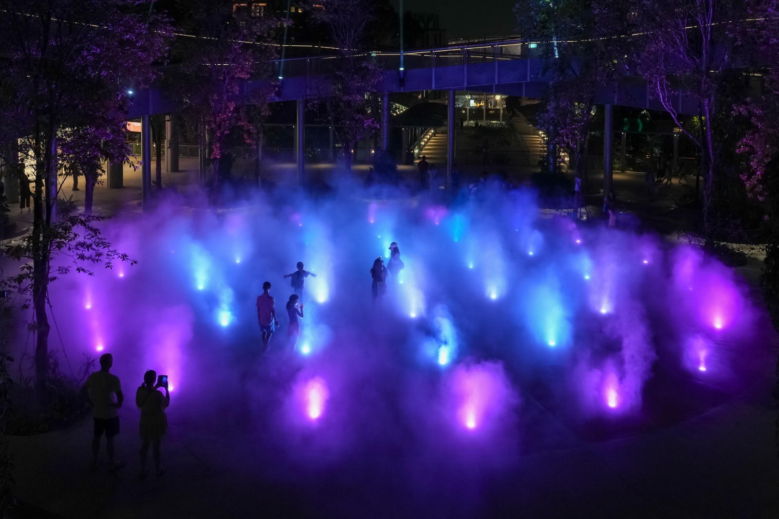 Inilah taman bermain di atas langit. Kita bisa bermain dengan air mancur dan kabut asap yang berembus dari lantai yang dipadukan permainan sinar cahaya berwarna-warni. Saat membuka aplikasi ImagiNite, akan tampak flora dan fauna khas Sentosa yang seolah sedang bermain dan berburu makanan.