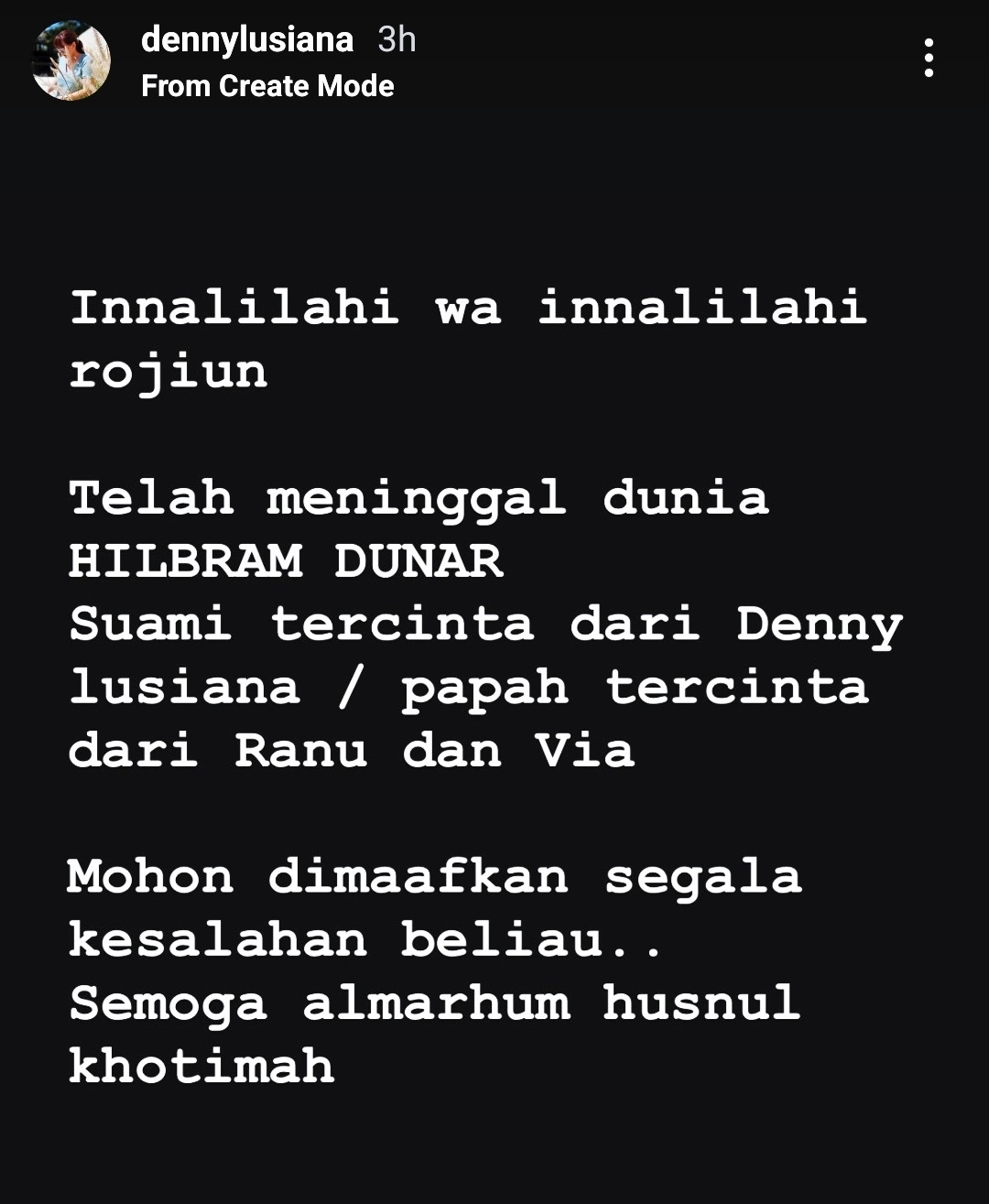 "Telah meninggal dunia Hilbram Dunar Suami tercinta dari Denny Lusiana/ papah tercinta dari Ranu dan Via. Mohon dimaafkan segala kesalahan beliau. Semoga almarhum husnul khotimah," tulis Denny di fitur story Instagram.