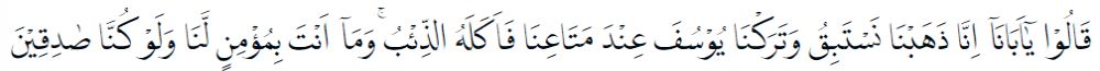 Qooluu yaaa abaanaaa innaa zahabnaa nastabiqu wa taraknaa Yuusufa \'inda mataa\'inaa fa akhalahuz zi\'b, wa maaa anta bimu\'minil lanaa wa law kunnaa saadiqiin