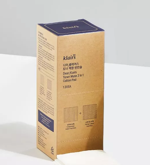 Brand kecantikan asal Korea Klairs juga memproduksi kapas wajah yang menjadi pilihan ketika menggunakan toner karena memiliki dua jenis permukaan yang berbeda. Sisi pertama permukaan kapas yang dipadatkan berfungsi untuk membersihkan wajah dan mengeksfoliasi kulit. Sisi lainnya dapat membantu menyerap produk skincare secara optimal. Tak hanya itu, produk kapas ini juga berlabel cruelty free dan vegan friendly. Klairs Toner Mate 2 in 1 Cotton Pads ini dibanderol dengan harga sekitar Rp 60 ribu.