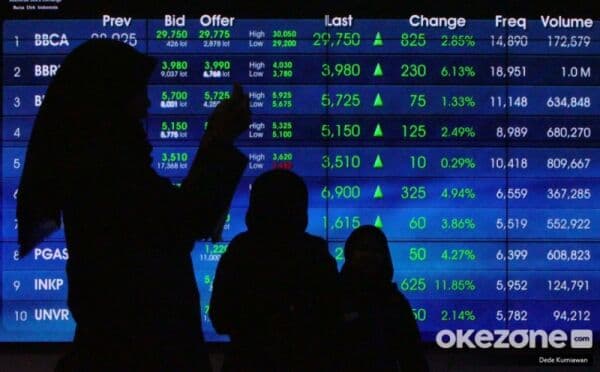 Siang ini, Rabu (30/4/2025), total volume saham yang diperdagangkan sebanyak 12,59 miliar saham dengan nilai transaksi mencapai Rp6,96 triliun, dan ditransaksikan sebanyak 728.947 kali. Adapun, sebanyak 294 saham harganya naik, 277 saham harganya turun dan 227 saham lain harganya stagnan.
