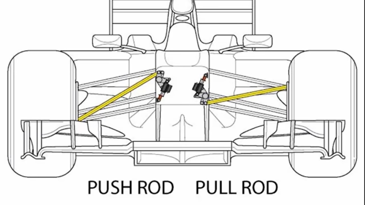 Pilihan di antara keduanya adalah geometri dan CoG (Pusat gravitasi). Juga pull-rod akan melentur dalam droop (roda turun) dan push-rod akan melentur dengan roda dalam benjolan (roda naik) maka push-rod atau tarik F1 adalah cetakan karbon besar untuk menahan lentur dari beban roda yang tinggi.