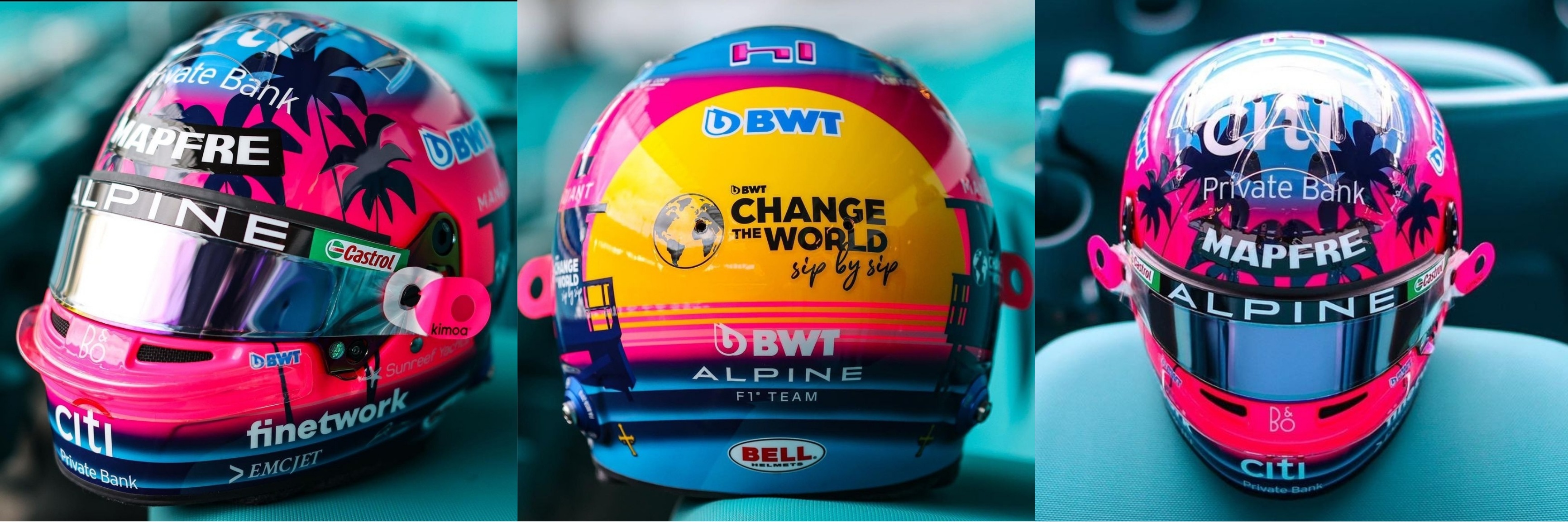 Fernando Alonso jadi satu-satunya pembalap Alpine yang menggunakan helm baru. Pembalap Spanyol itu memakai desain matahari tenggelam, terlihat gambar matahari besar di bagian belakang, dan bayangan pohon kelapa di tepi pantai di depan. Dengan warna dasar perpaduan merah muda dan biru mencolok.