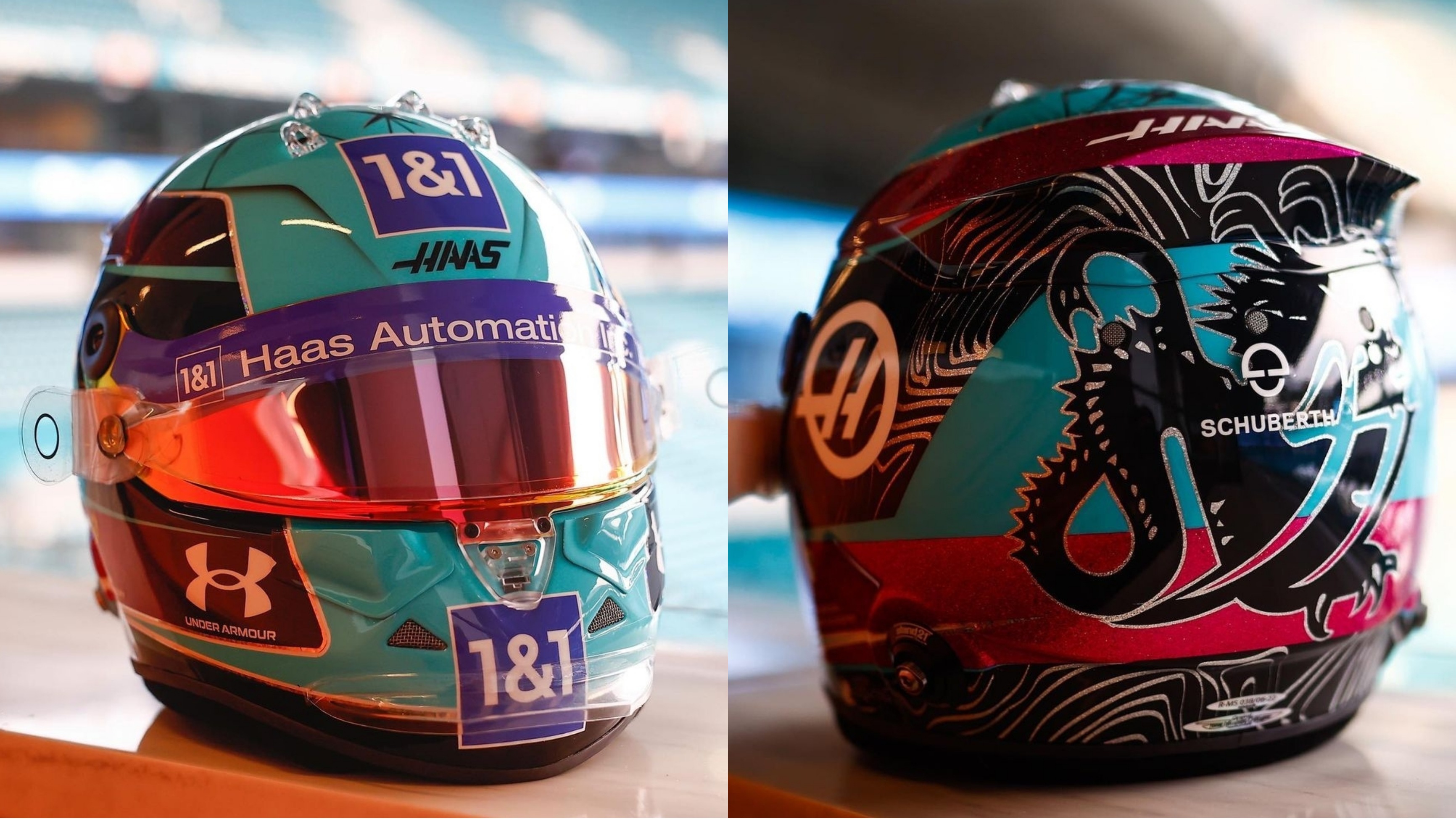 Lalu ada Mick Schumacher yang hadir dengan helm biru muda dengan kombinasi aksen hitam dan merah muda, lalu bisa dilihat terdapat ukiran dan gambar naga berwarna silver sebagai ciri otentik pembalap asal Jerman itu.