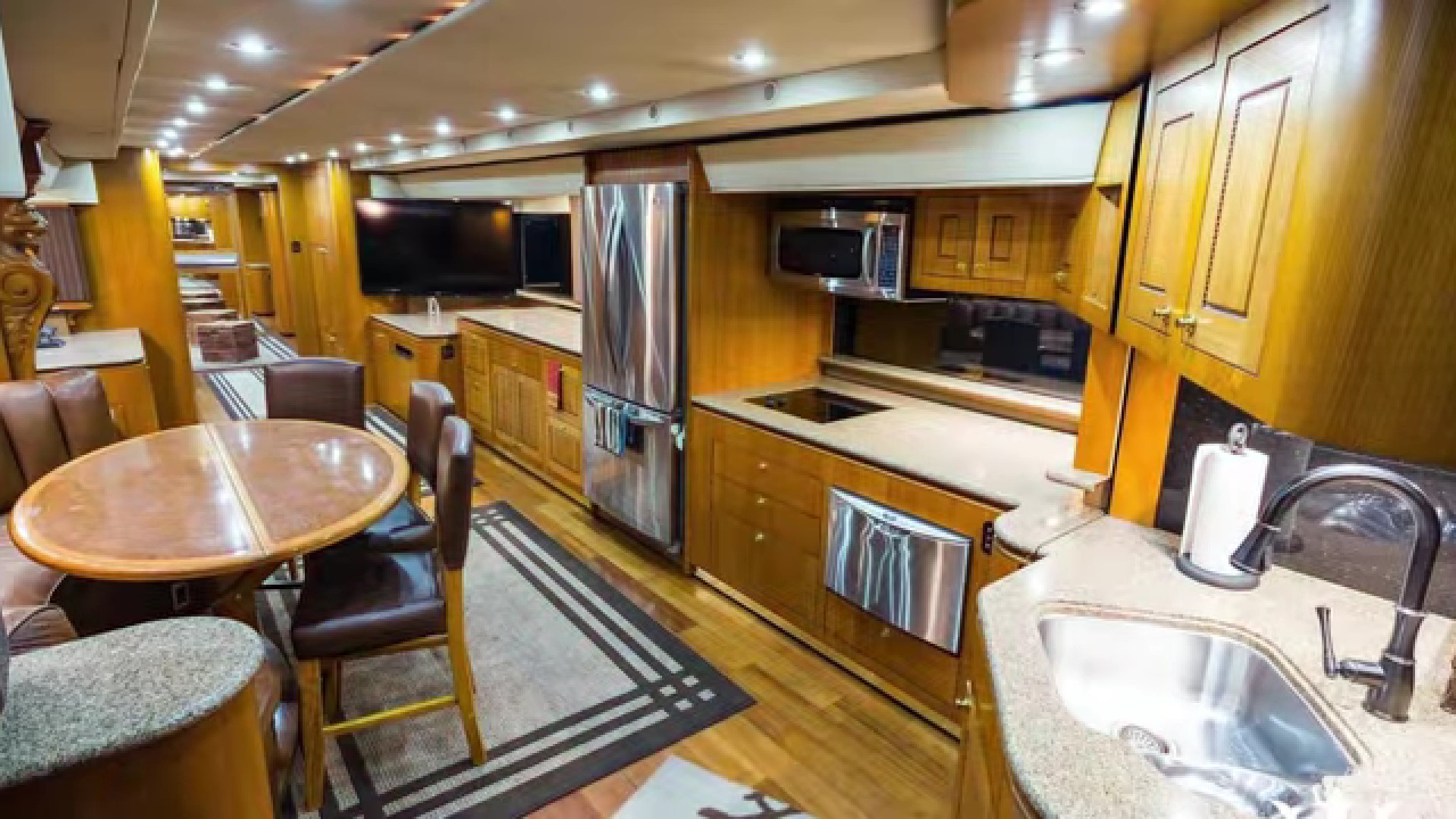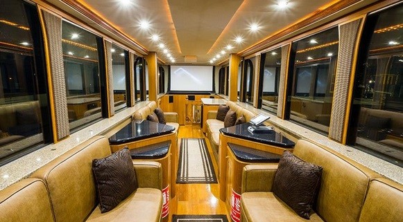 Interior mobil ini dilapisi kulit senilai lebih dari 300.000 dolar AS, dan dapur mewah 200.000 dolar AS dengan lemari es tiga pintu, mesin pencuci piring, dan granit senilai 125.000 dolar AS.