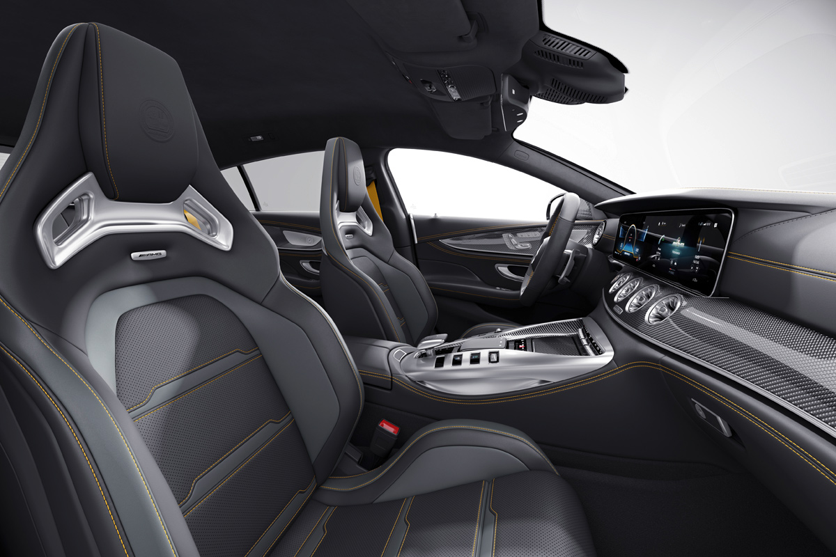 Atap panorama tentunya akan membuat AMG GT 63 S E Performance terlihat lebih resik, apalagi balutan kulit di jok adalah material Exclusive nappa dipadukan sambungan jahitan kuning kontras.
