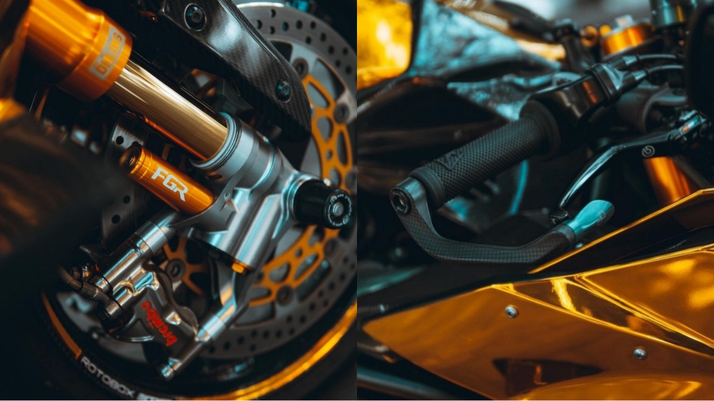 Selain estetika, ada ubahan lain untuk menunjang performa dan keamanan. Misalnya hand guard dan tabung minyak rem Lightech, suspensi depan dan steering damper menggunakan Ohlins FGR 300. Lalu sistem rem semua sudah Brembo. Baik tuas, kaliper GT4RX dan piringan model floating.
