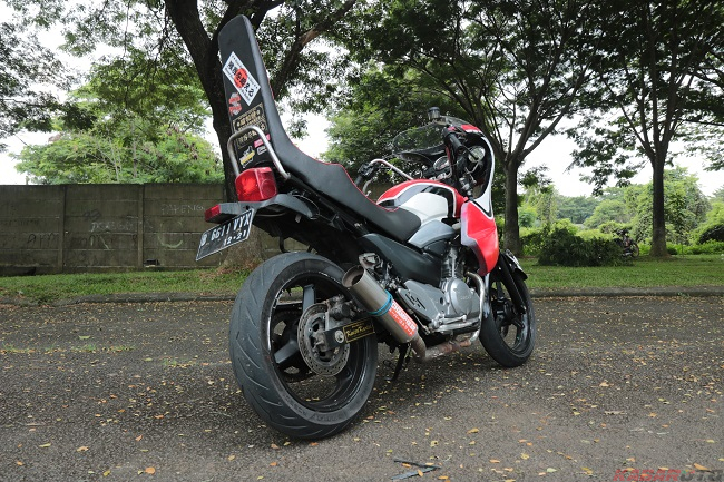 "Kalau dari fairing itu desain sendiri, untuk cetak menggunakan bahan fiber dan pembuatannya saya minta bantuan ke bengkel mobil yang sudah dikenal. Fairing roket ini juga mudah karena sistemnya plug n play. Terus untuk knalpot itu custom freeflow dan jok modif style sandan. Kalau untuk rangka dan mesin masih standar bawaan pabrik. Lalu, untuk bagian setang itu saya pakai punya motor Viar tiga roda," lanjut Bowie.