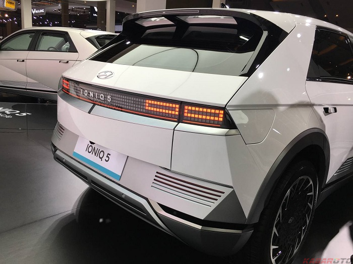 Adapun bagian belakang, terdapat lampu LED dengan kotak-kotak kecil seeprti di Staria ini dengan model memanjang serta terdapat logo Ioniq 5 dibalik mika kaca. Pada bagian bumper, terdapat mata kucing yang cukup panjang dan tipis serta aksen add-on bodi.