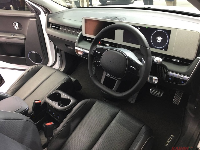Pada bagian belakang lingkar kemudi, terdapat paddle shift beserta tuas transmisi. Untuk bagian instrument kluster TFT, lalu head unit besar ini bisa mengatur beberapa bagian mobil dan menampilkan kondisi baterai. Bagian tengah dasbor, terdapat panel control AC dan power outlet 12V dengan USB fast charging. Tidak lupa, ada cup holder dengan dua USB fast charging.