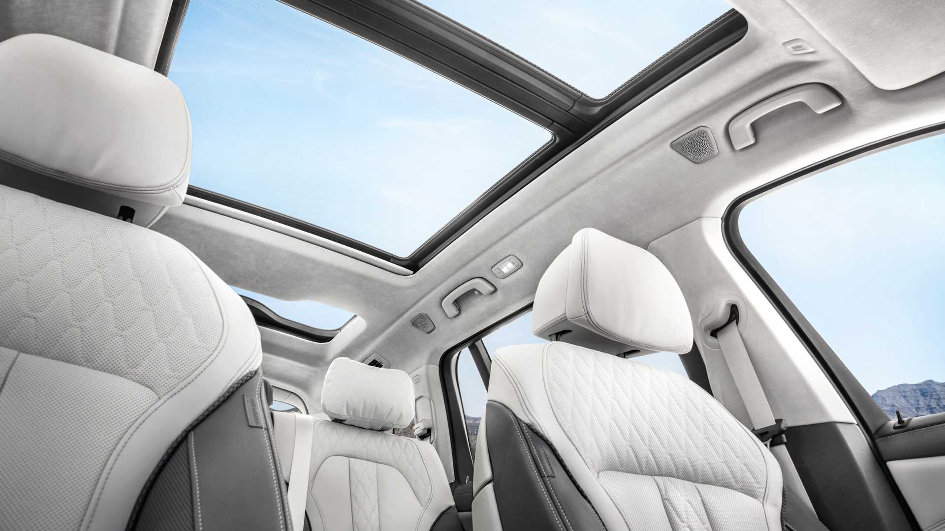Pada bagian dasbor hingga konsol tengah dibalur dengan warna kayu krem yang mewah dengan jahitan Nappa Leather berwarna abu-abu gelap. Pada bagian jok hadir dengan kontur yang dijahit kulit dab warnanya senada dengan dasbor. Sementara, untuk varian paling tertinggi mendapatkan jok kulit Extended Merino. Tetapi, jika kurang puas pihak pabrikan memberikan opsi paket serat karbon dengan lambing BMW M 50 tahun retro.